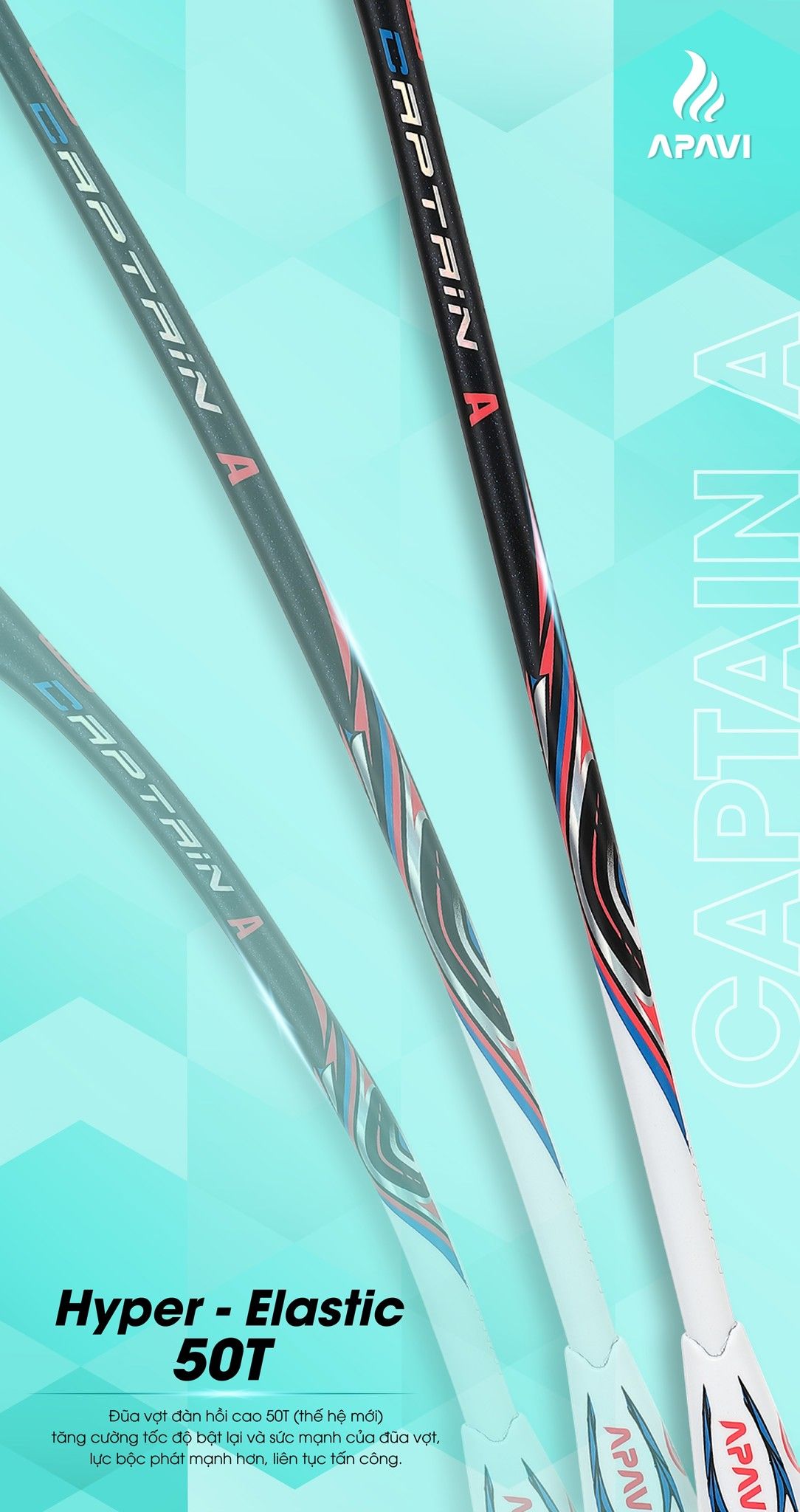 Captain A là cây vợt lý tưởng dành cho người chơi yêu thích lối đánh mạnh, smash uy lực, nhờ vào thân vợt Hyper-Elastic 50T kết hợp với lực căng tối đa 30lbs.