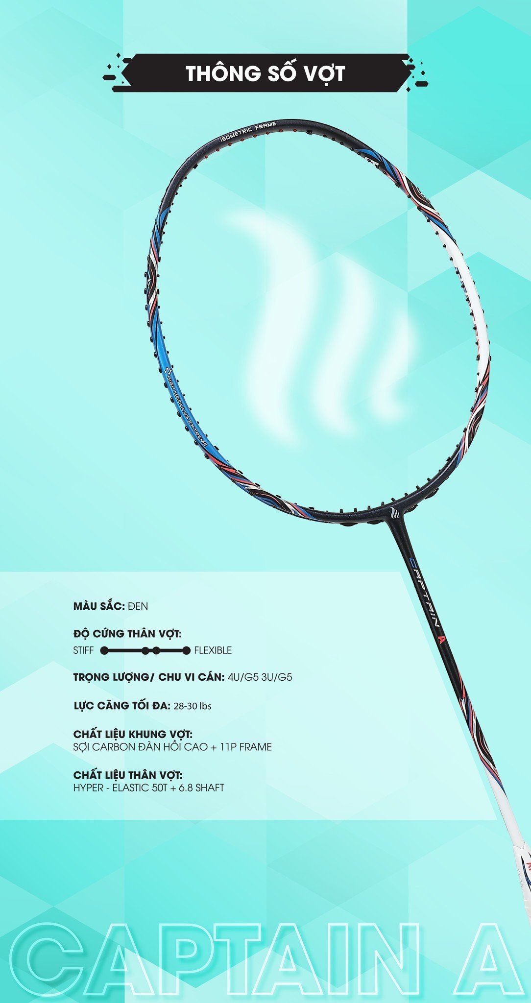 Được thiết kế để hỗ trợ cả lối chơi tấn công mạnh mẽ và phòng thủ chắc chắn, Captain A có độ nặng đầu và độ cứng thân vợt được điều chỉnh hoàn hảo, giúp bạn dễ dàng điều cầu, thực hiện những cú smash dứt khoát hoặc những pha phản công thông minh.