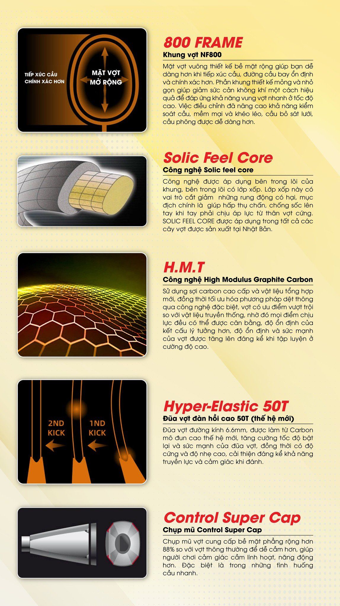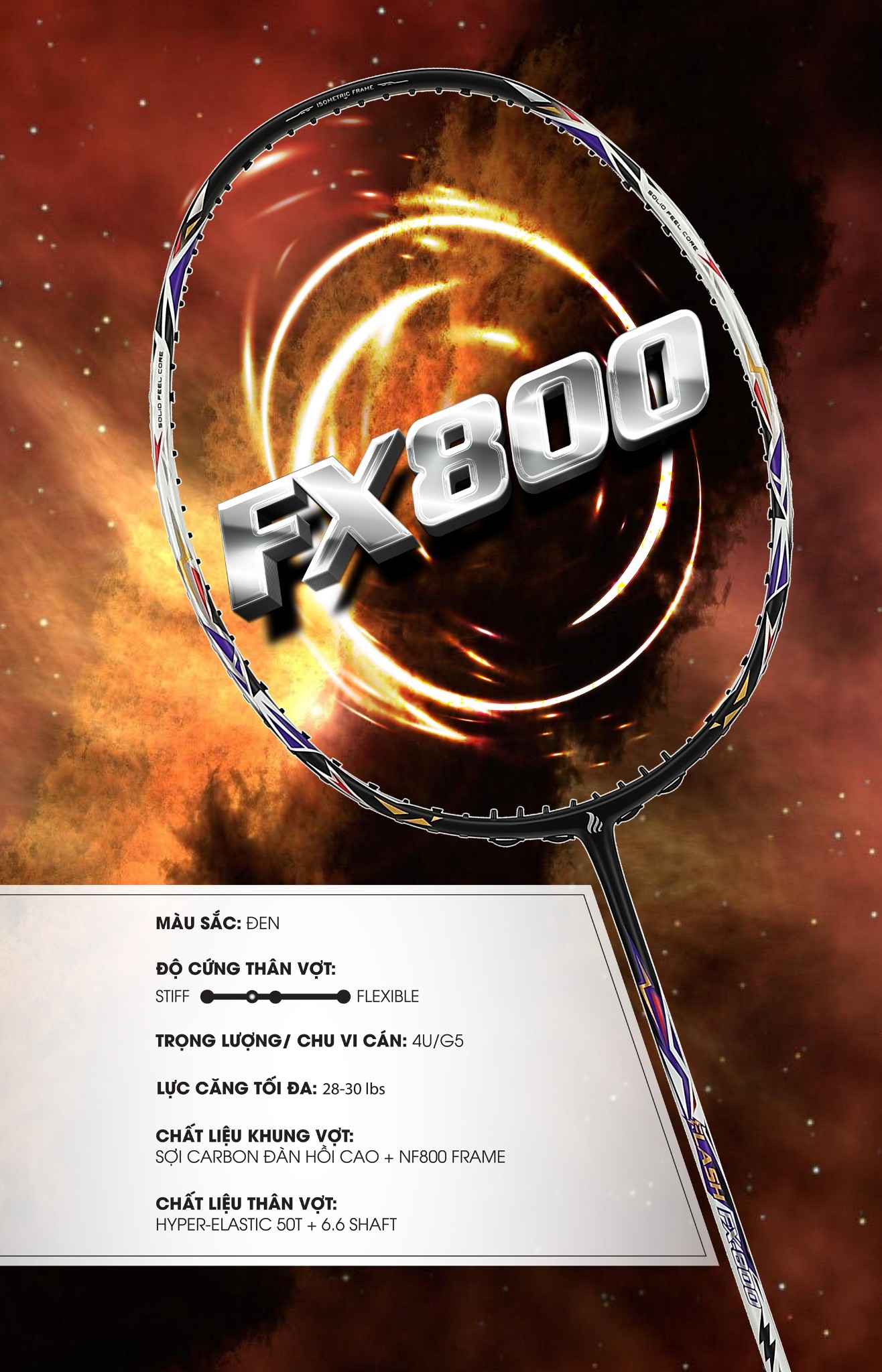 FX800 được thiết kế dành riêng cho những tay vợt ưa thích lối chơi tốc độ, với công nghệ Hyper-Elastic 50T, giúp đũa vợt đàn hồi tốt hơn, tăng cường lực đánh mà không cần tốn nhiều sức. Bên cạnh đó, với mặt vợt rộng NF800, vợt giúp tăng diện tích tiếp xúc cầu, tối ưu góc đánh và kiểm soát chính xác hơn.