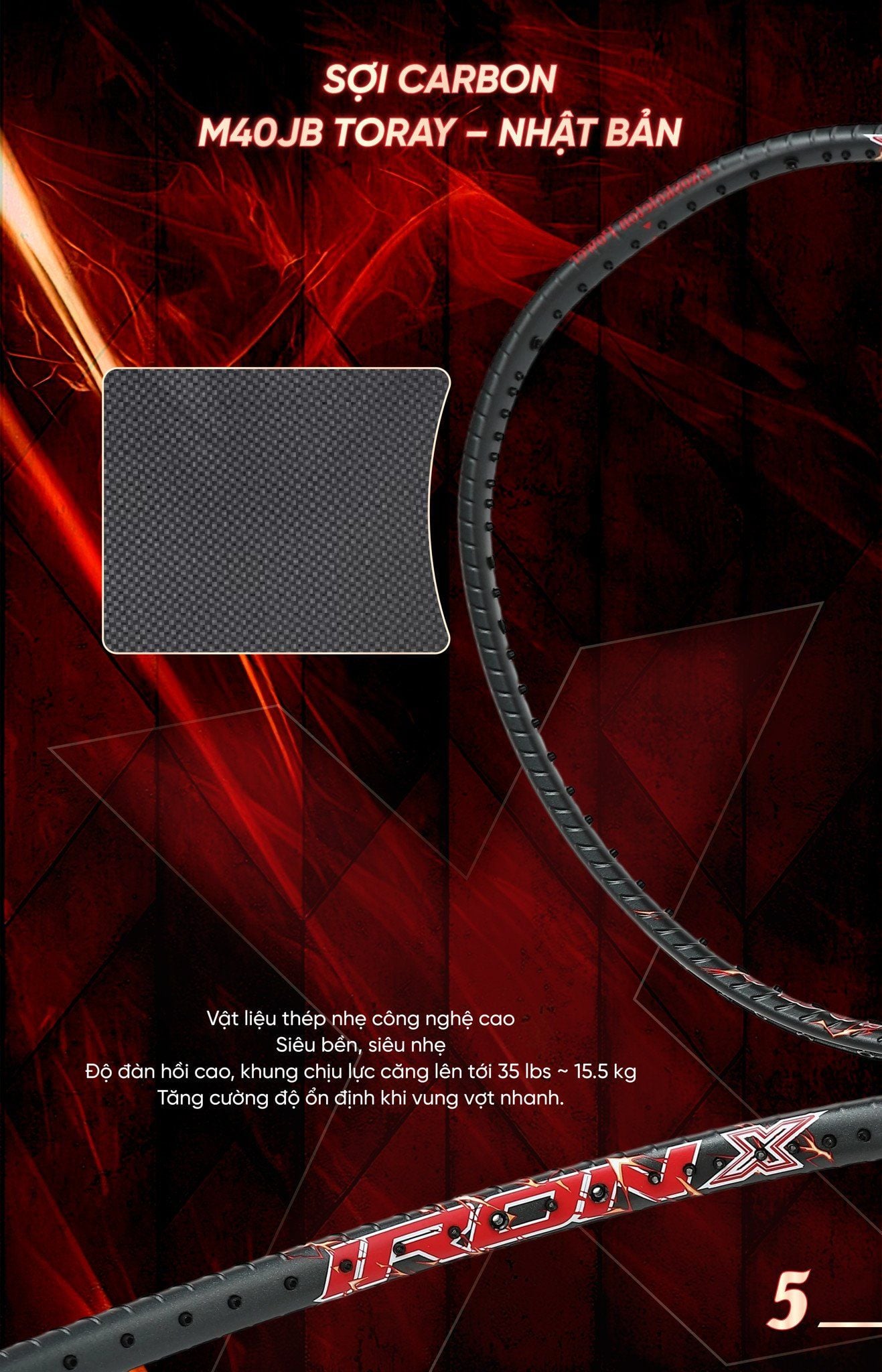 | Vật liệu | Sợi carbon cao cấp M40JB – Toray Nhật Bản |