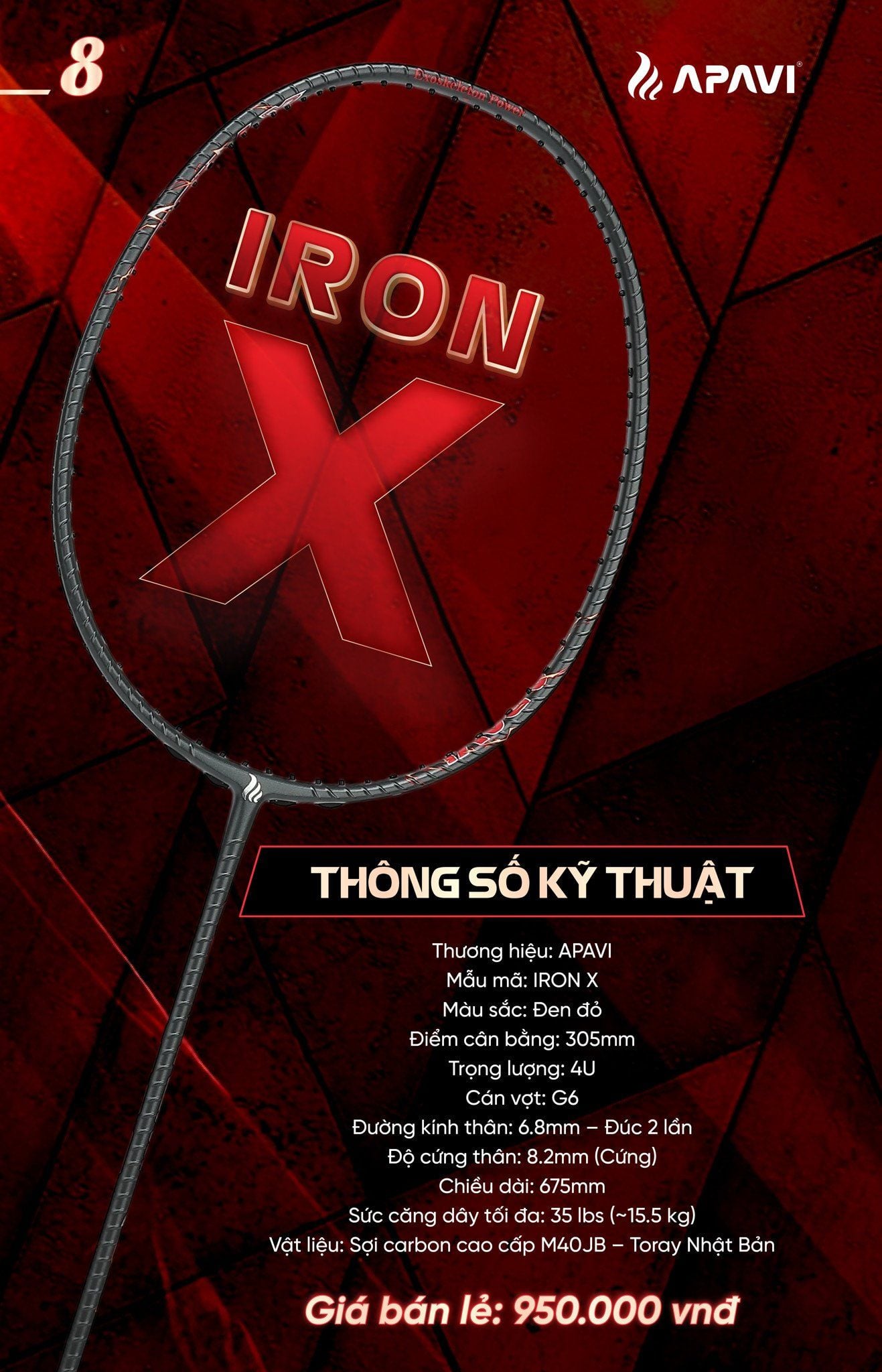 APAVI IRON X là cây vợt tấn công nổi bật trong phân khúc dưới 1 triệu đồng, dành cho người chơi phong trào và bán chuyên yêu thích lối đánh mạnh mẽ, tốc độ. Sở hữu vật liệu carbon cao cấp từ Toray Nhật Bản, công nghệ Exoskeleton Power System, cùng khả năng chịu lực căng tới 35 lbs, IRON X mang đến hiệu suất vượt trội trong tầm giá.