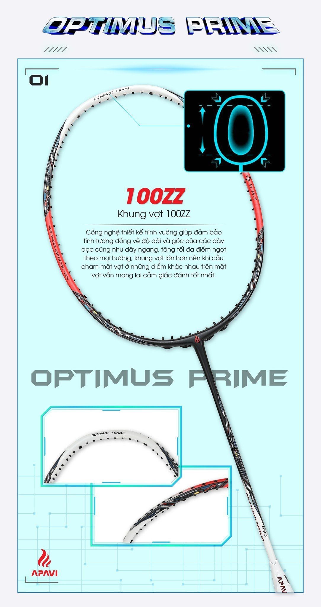 Với khung vợt 100ZZ tối ưu điểm ngọt, thân vợt sử dụng công nghệ Dual Carbon Shaft giúp tăng khả năng chống xoắn, cùng với Hyper-Elastic 50T – công nghệ carbon siêu đàn hồi, Optimus Prime giúp người chơi thực hiện những cú đập cầu chính xác, mạnh mẽ nhưng vẫn đảm bảo sự kiểm soát tối đa.