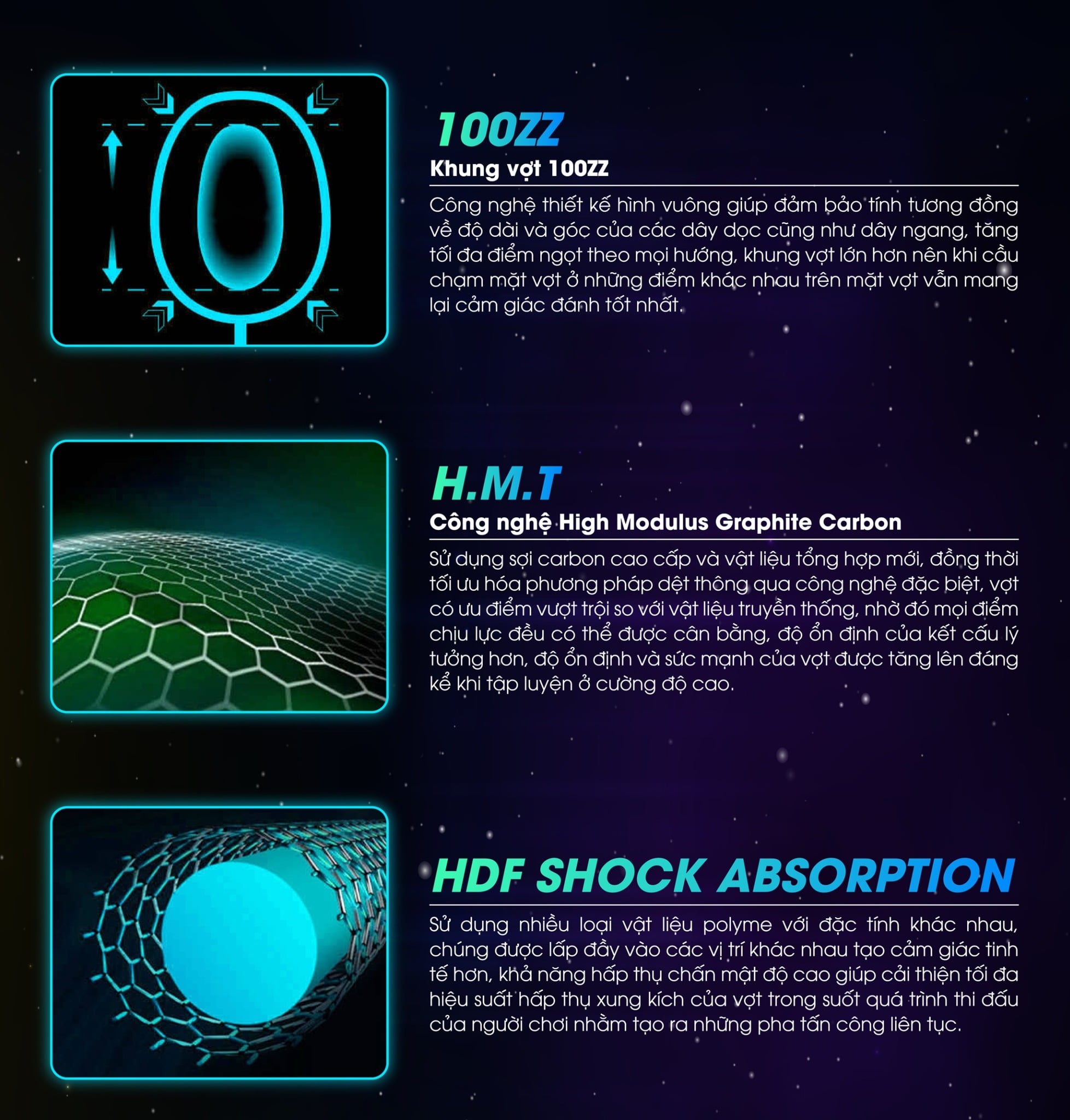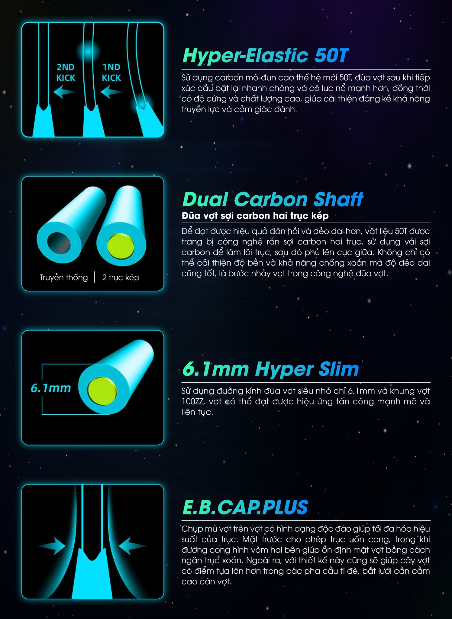 - Chất liệu thân vợt: Dual Carbon Shaft + Hyper-Elastic 50T