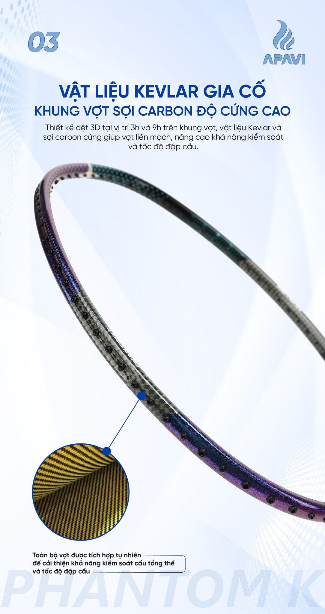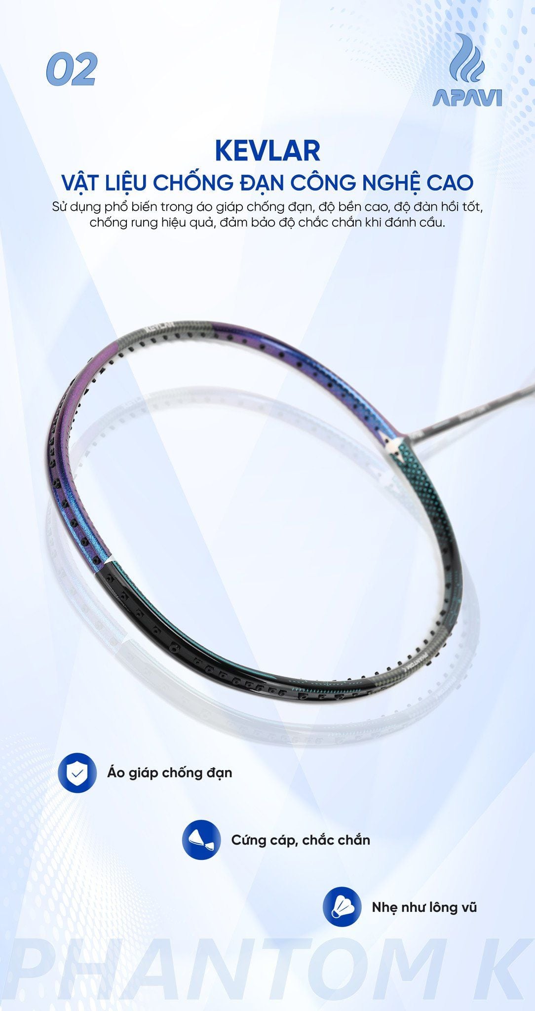 Kevlar là chất liệu thường được sử dụng trong áo giáp chống đạn nhờ khả năng chịu lực cao, giảm rung cực tốt. Khi tích hợp vào khung vợt Phantom K, Kevlar giúp: