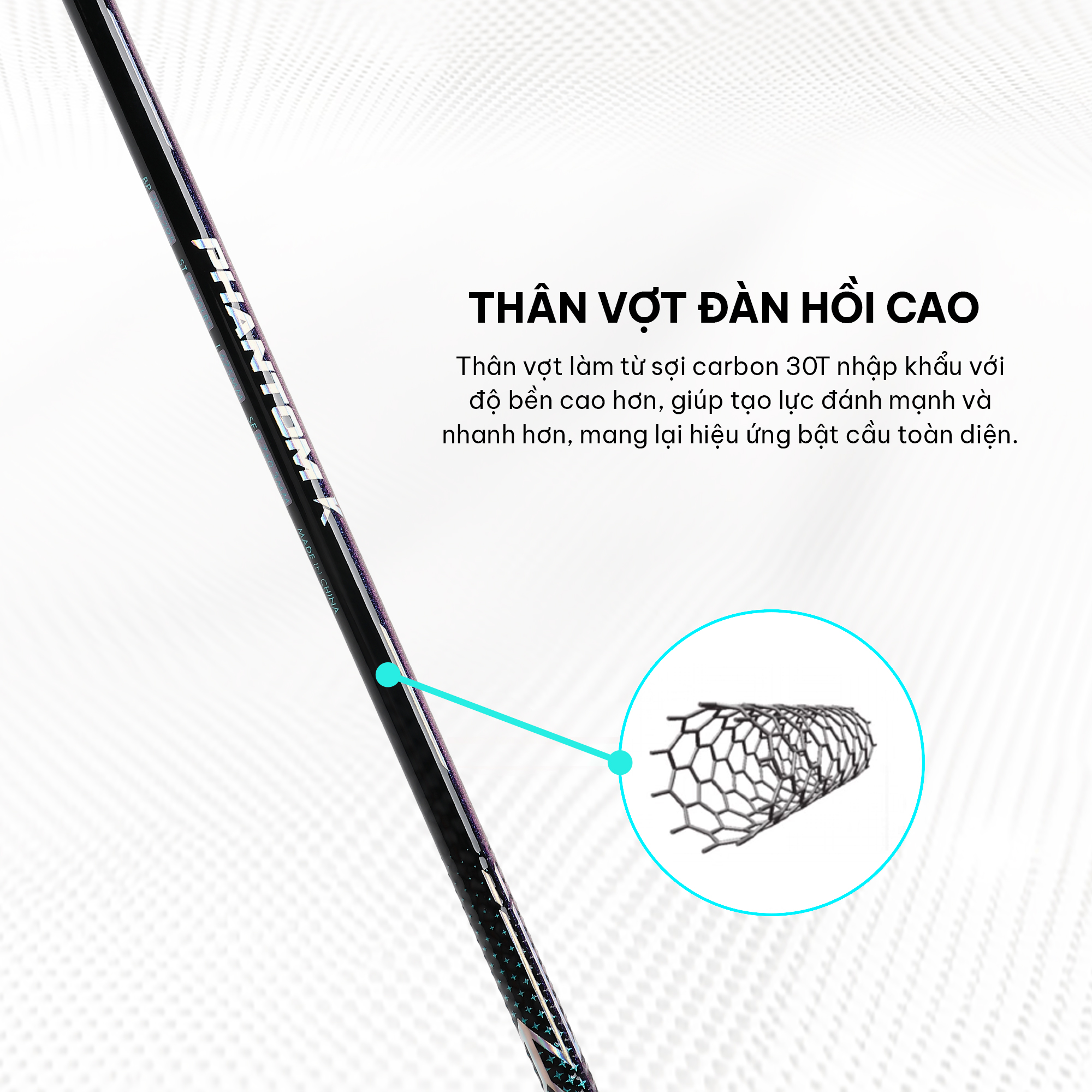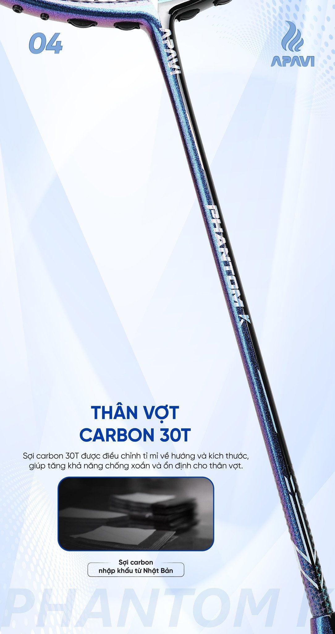 Phần khung và thân vợt sử dụng sợi carbon modulus cao (30T) – vật liệu siêu nhẹ, siêu cứng, giúp: