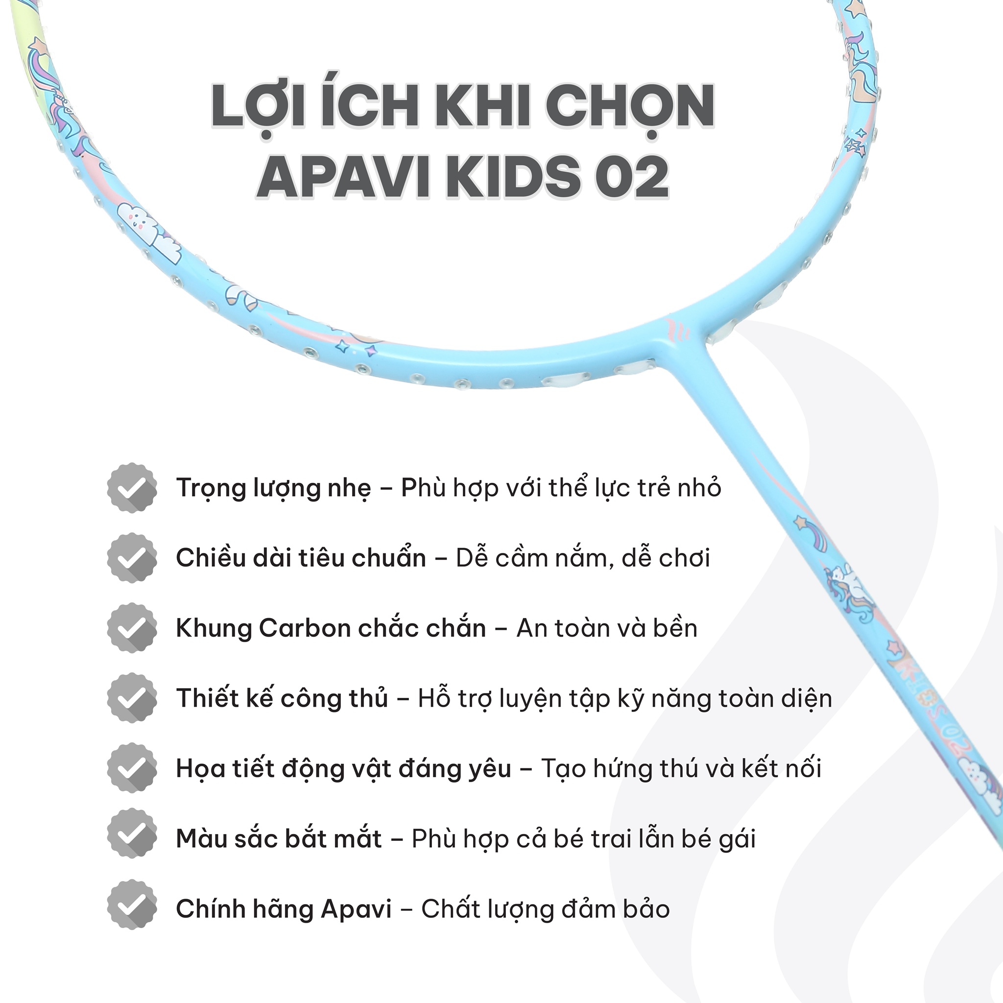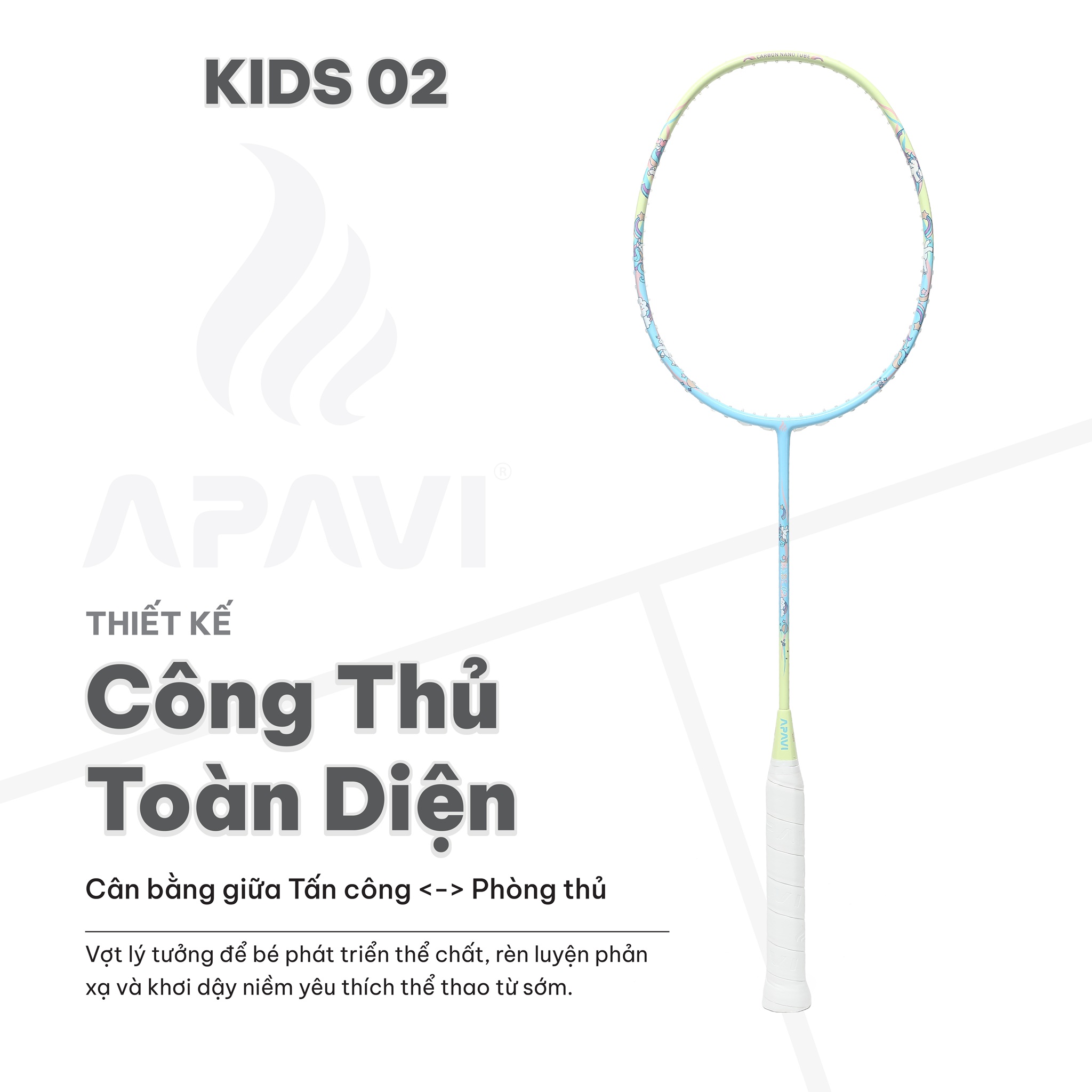 Apavi Kids 02 là sự lựa chọn hoàn hảo cho cha mẹ muốn đầu tư một cây vợt chuyên biệt cho trẻ, giúp bé vừa vui chơi, vừa rèn luyện thể chất một cách lành mạnh.